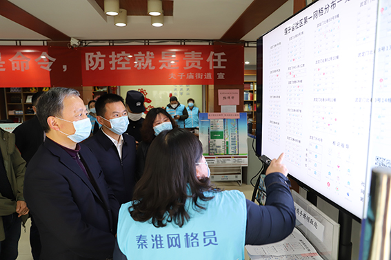 在夫子庙街道莲子营社区,徐锦辉书记实地检查了社区疫情防控工作开展情况,细致察看了相关工作台账,仔细询问了涉外疫情防范处置现状,对该社区依托《网格分布一览表》、社区居民微信群、平安志愿服务等创新举措,深入开展网格化治理和疫情防控工作给予了高度评价。他强调,要系统集成疫情防控工作经验做法,突出抓好物、事、房、人等重点要素,推动“以网管物”“以格管事”“以房管人”落地见效。