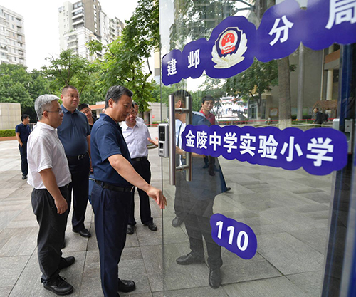 在金陵中学实验小学,徐锦辉一行重点了解了公安护学岗、“校园安全云卫士平台”、视频监控、一键报警等建设情况,察看了学校内的微型消防站、防暴站以及禁毒校园宣传点。在随后召开的调研座谈会上,徐锦辉认真听取了市公安局、建邺区等相关单位关于开展智慧小区和智慧校园建设方面的工作情况。