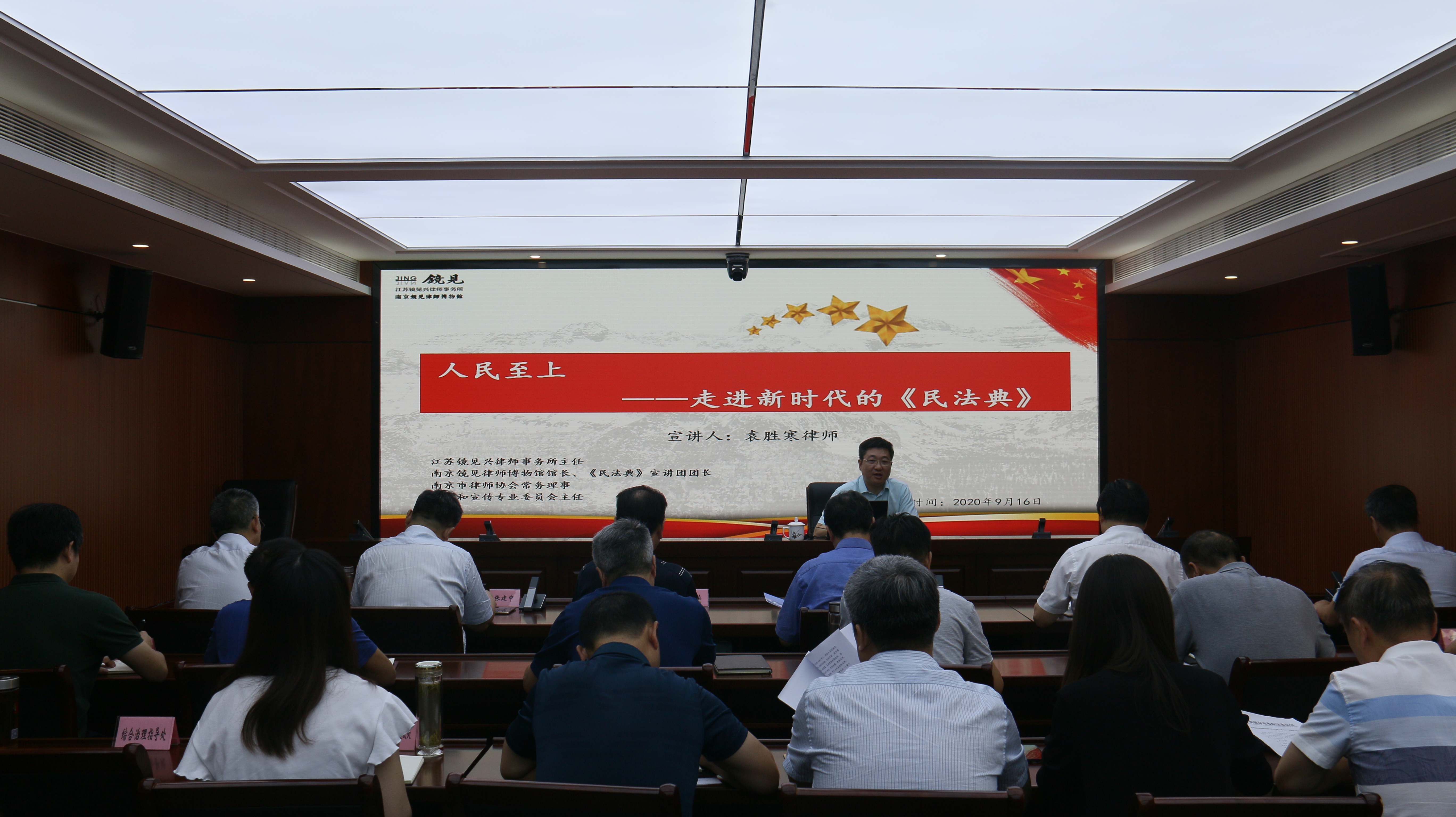 活动邀请了江苏镜见兴律师事务所主任袁胜寒律师,以“人民至上——走进新时代的《民法典》”为主题,围绕《民法典》的时代背景、颁布意义与价值、体系构建与亮点、具体内容与制度创新等方面阐释了《民法典》的核心要义,并结合实际就有关内容进行了重点阐述,融学术性、实用性、指导性于一体,既有理论高度又有生动案例,对社会和法务操作中的热点难点问题具有很强的针对性。参加学习的同志普遍认为,本次学习对深刻领会习近平总书记全面依法治国新理念新思想新战略、提升自身法治素养具有重要的现实指导意义。