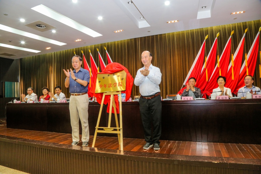 省关工委常务副主任李明朝和市关工委常务副主任胡序建共同为鼓楼区少年法学院揭牌;