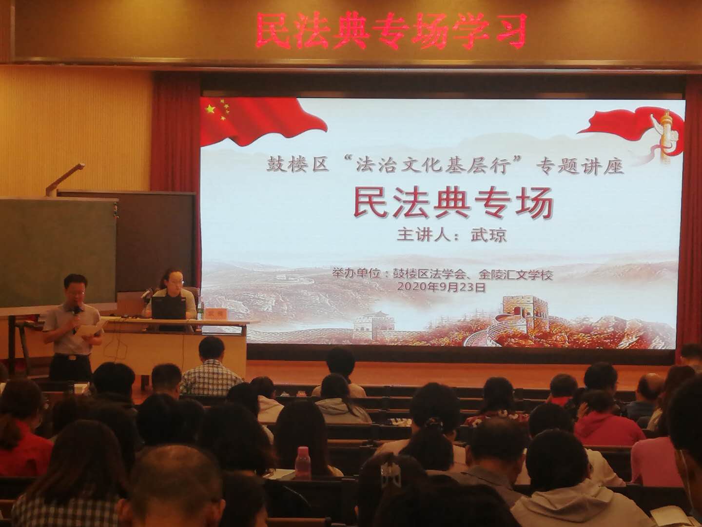 9月23日下午,鼓楼区“法治文化校园行”——“民法典学习专场会”,在南京金陵汇文学校中学部报告厅举行。该校各年级部200余名老师参加了学习活动。