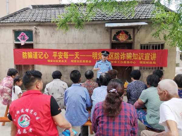 区公安分局政法网格员化身 “护航员”,为石湫街道明觉社区村民开展电信诈骗防范讲座
