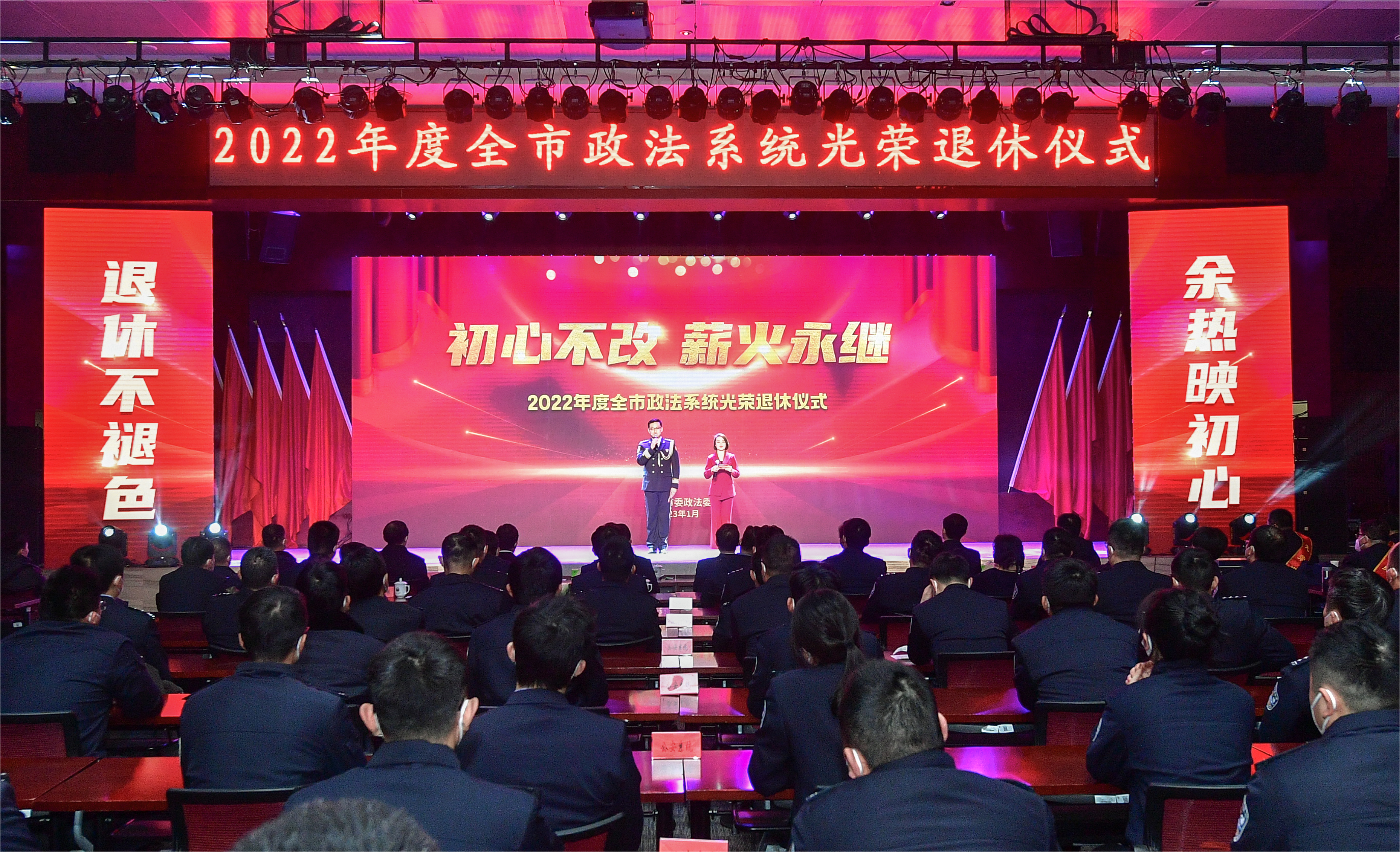 1月15日,市委政法委举办2022年度政法干警光荣退休仪式,政法系统退休干警和青年干警代表共同见证政法人光荣光辉时刻。